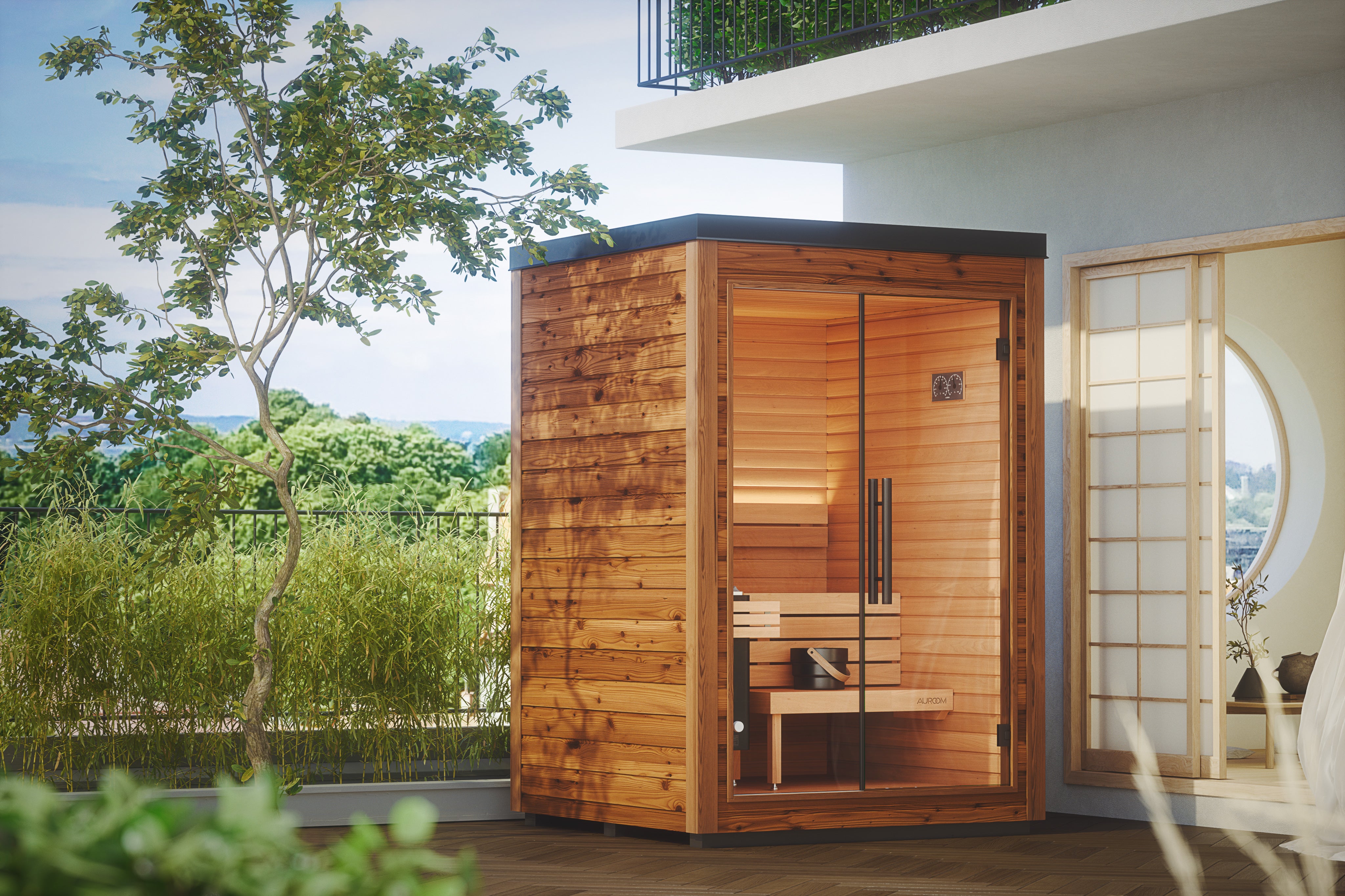 Mira can be installed on terraces, balconies and smaller gardens, with the small, lightweight components enabling easy hoist-free assembly. The S and L size options, which can accommodate up to two and four users respectively, allow you to make the most of the available space in your outdoor area. There are also two colors available for the exterior cladding, with a stunning natural look and a sleek black finish to choose between.