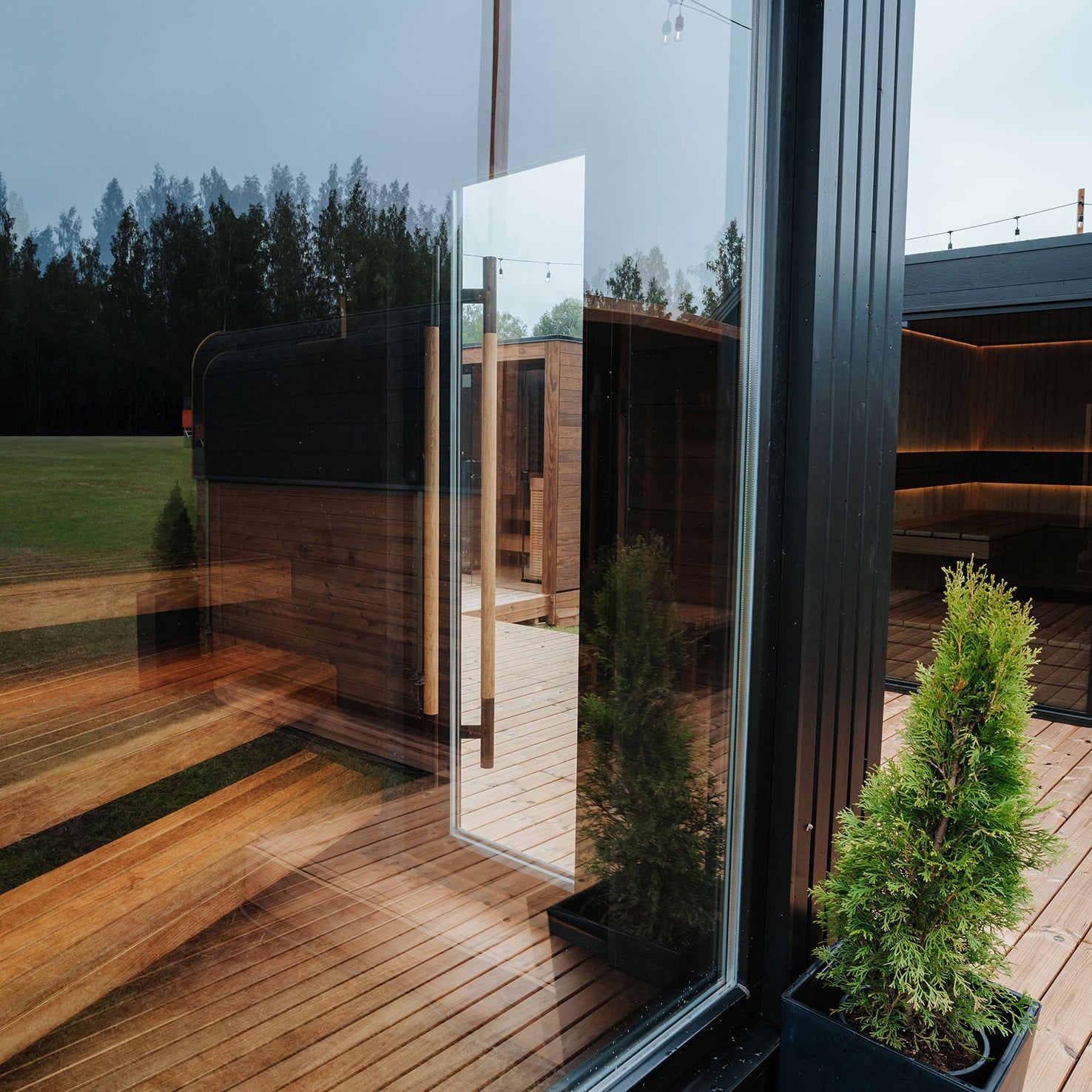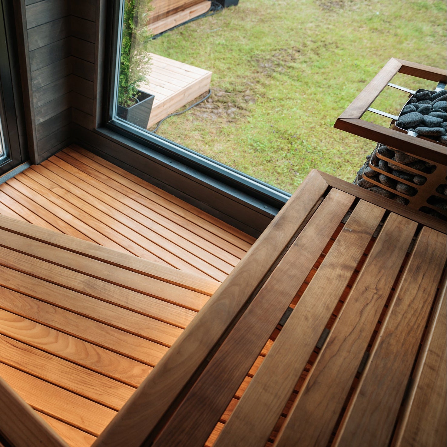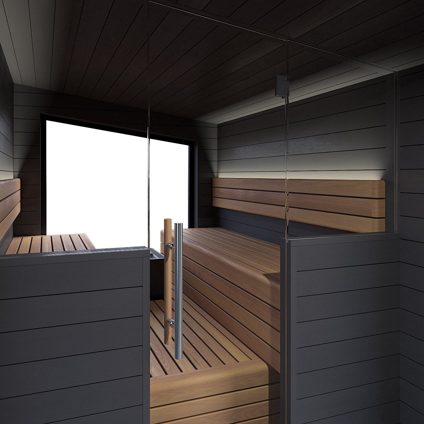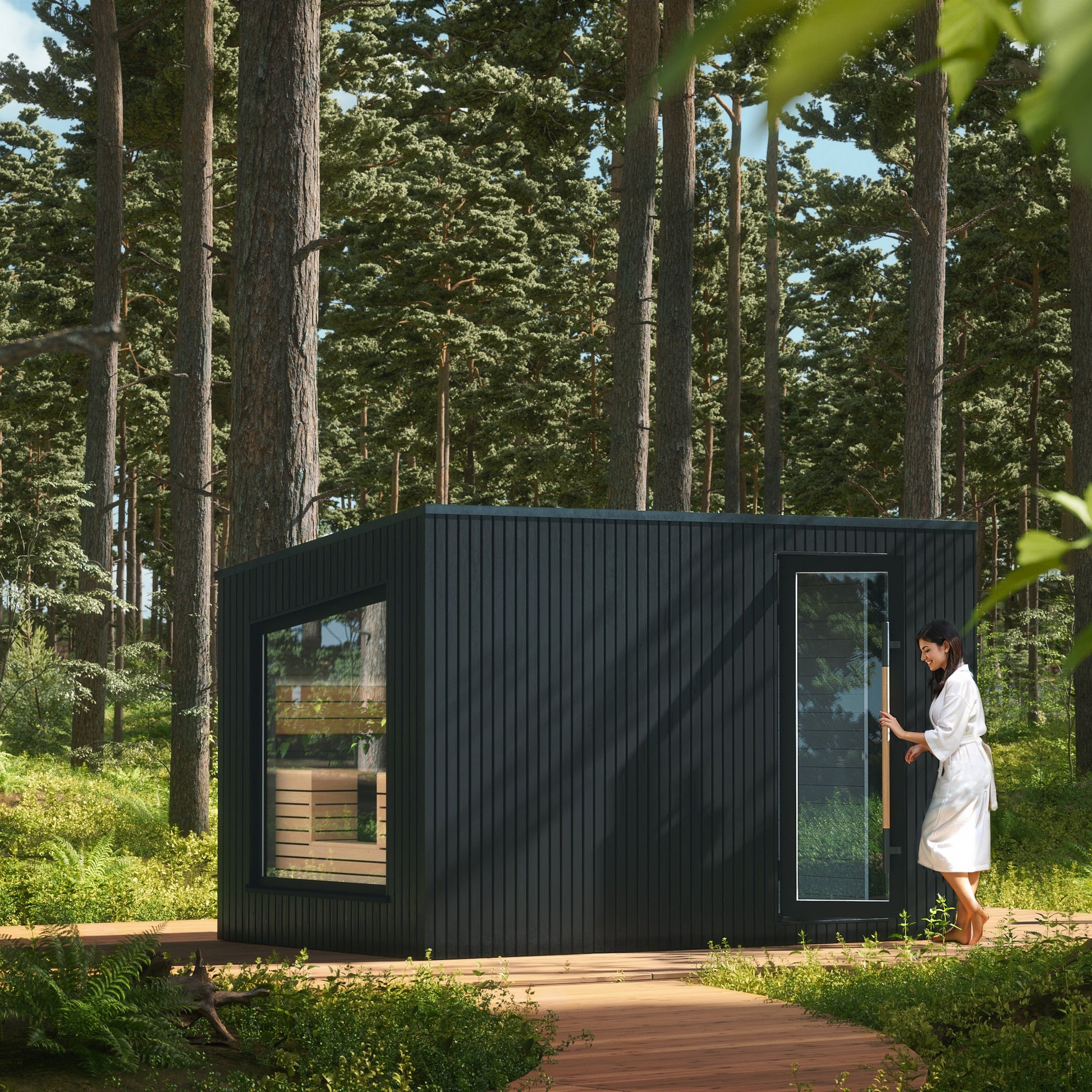 Black – thermo-pine coated with translucent black paint for a modern, stylish exterior that contrasts with the lighter materials